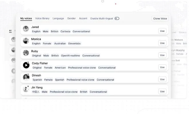 Choose from 100+ voices, accents and languages or clone your own voice directly from the platform.